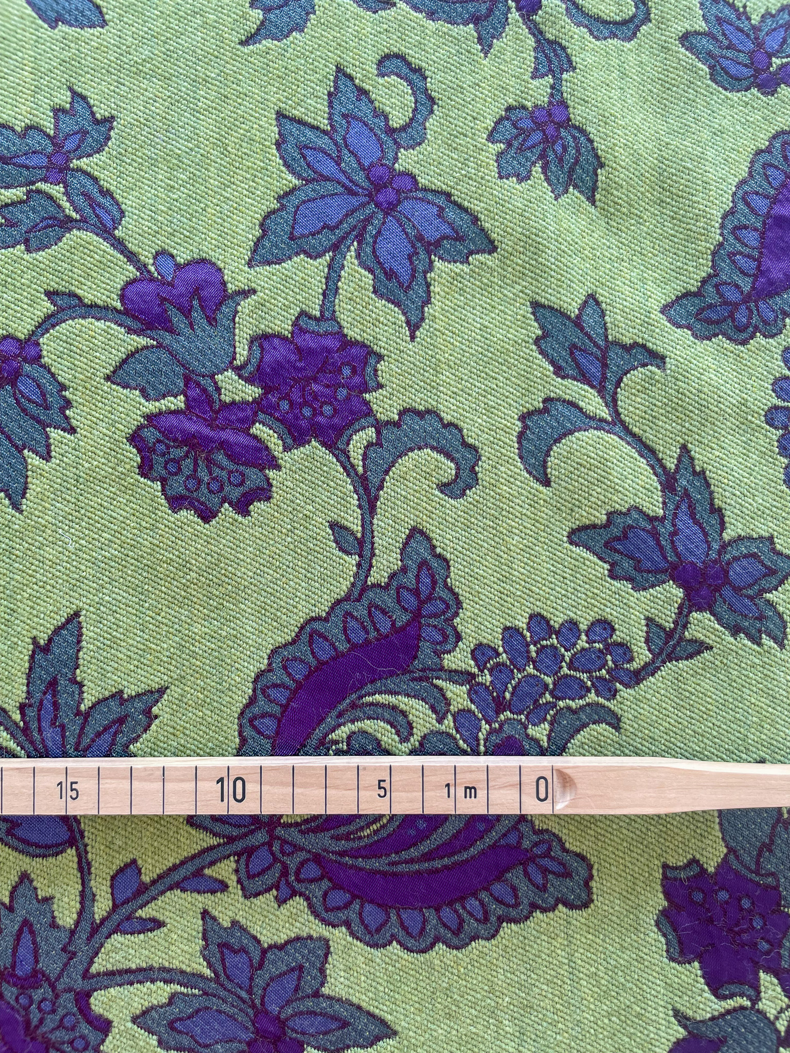 Dieses wunderschöne Woll-Misch-Gewebe leuchtet in einem frischen gelb-grün und violetten, stilisierten Blüten. Er lässt sich wunderbar zu einem langen weich fallenden Rock oder aber auch zu einem Mantel verarbeiten.