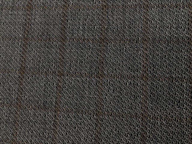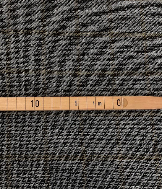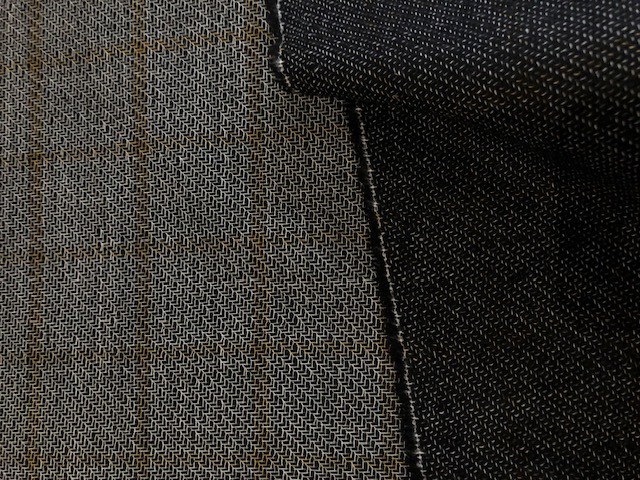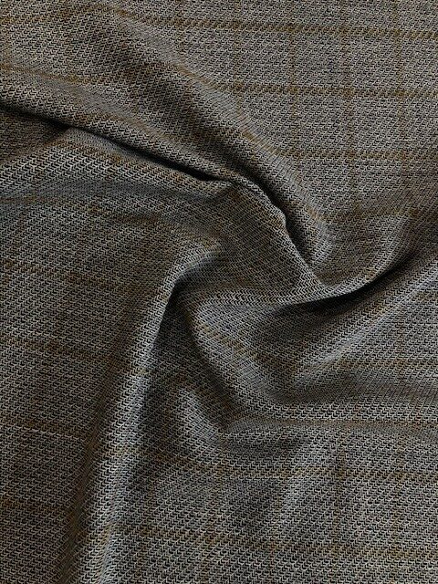 Sehr eleganter, klassischer Wollstoff mit feinem Karo-Muster in der Farbe ocker auf schwarzem Grund und durchwirkt von feinen naturweißen Fäden, was den Stoff in einem warmen Braunton erscheinen lässt.
