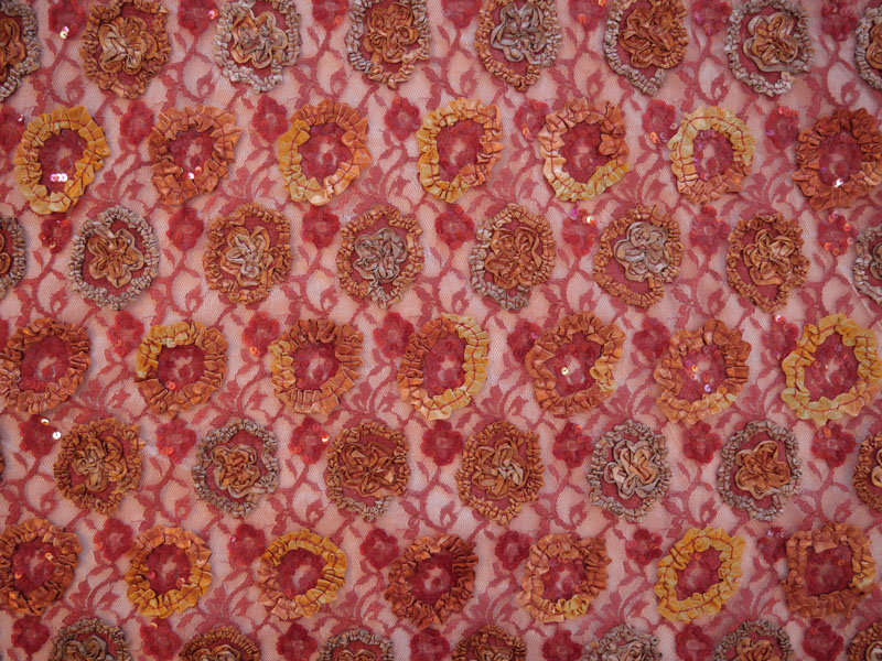 Dieser aufwendig bestickte Tüll eignet sich ganz besonders zur Fertigung eines festlichen Outfits. Das Grundmaterial ist ein himbeerroter Tüll auf dem verschiedene Blüten (Größe ca. 6 cm) aus einer Bändchenstickerei platziert sind. Zusätzliche Akzente setzen die roten Pailletten und sorgen damit für ein sehr harmonisches Farbbild.