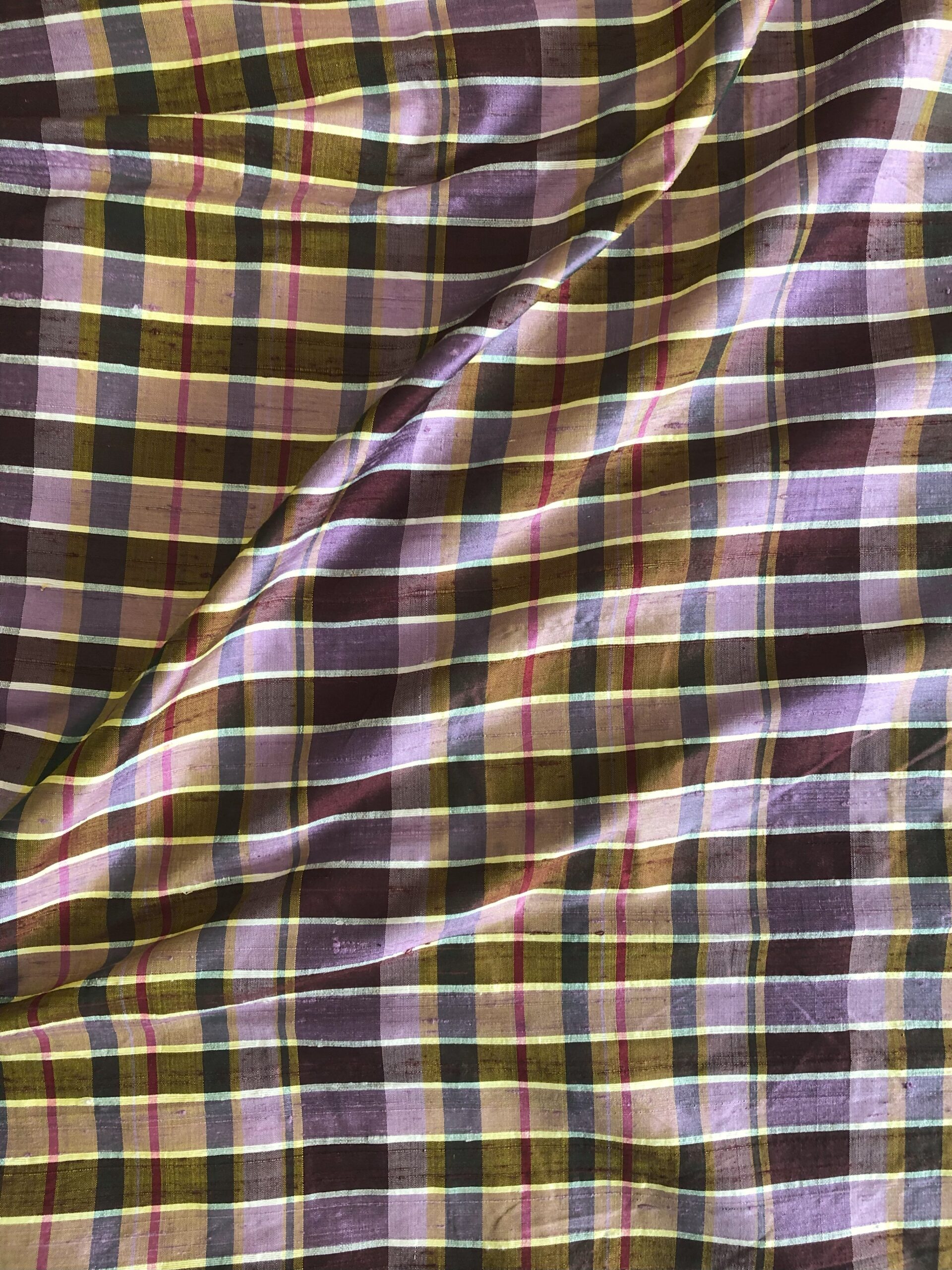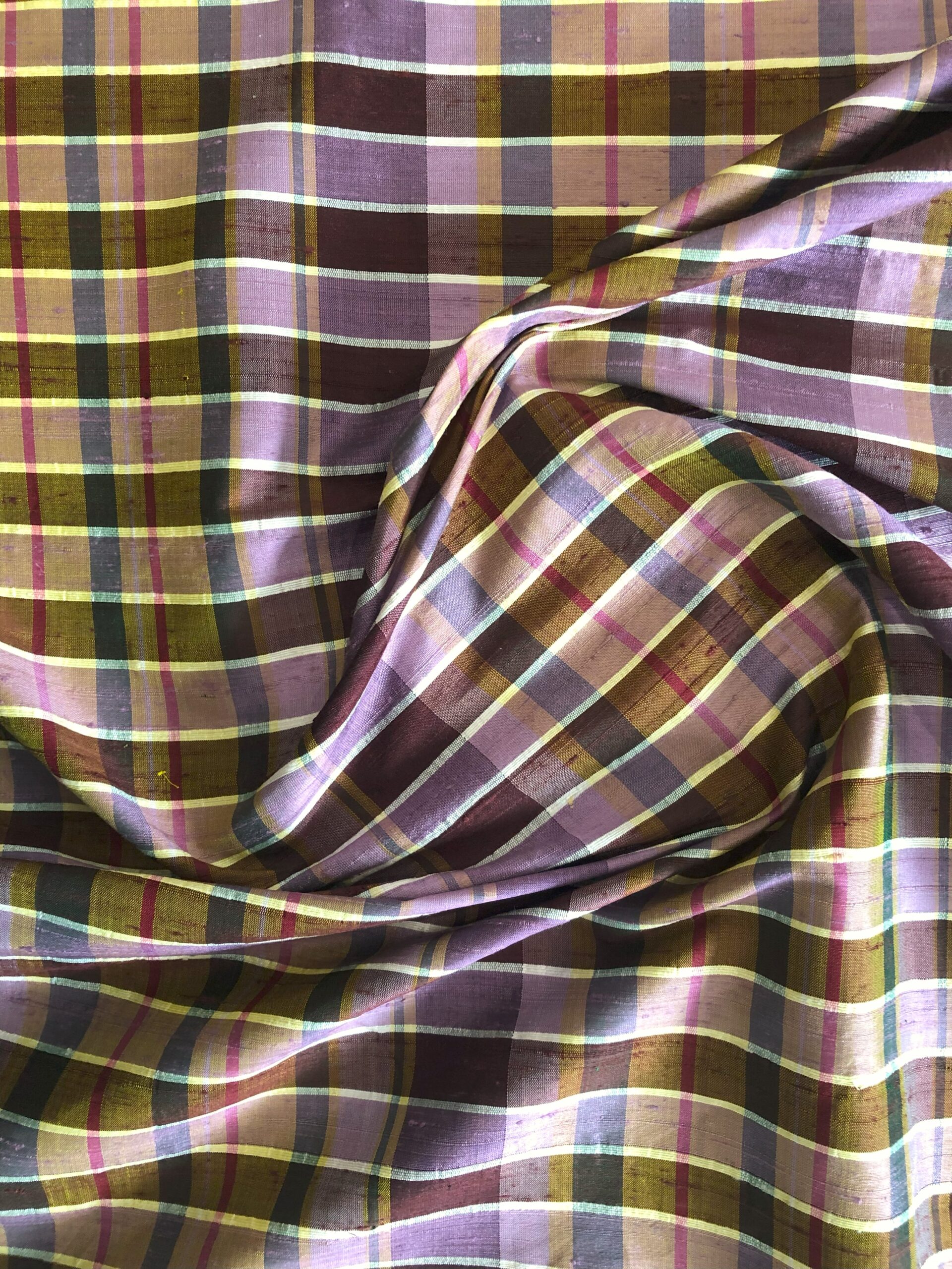 Schöne, karierte Dupionseide in den Herbstfarben grün und violett.