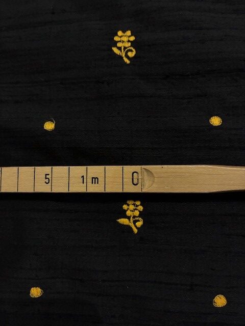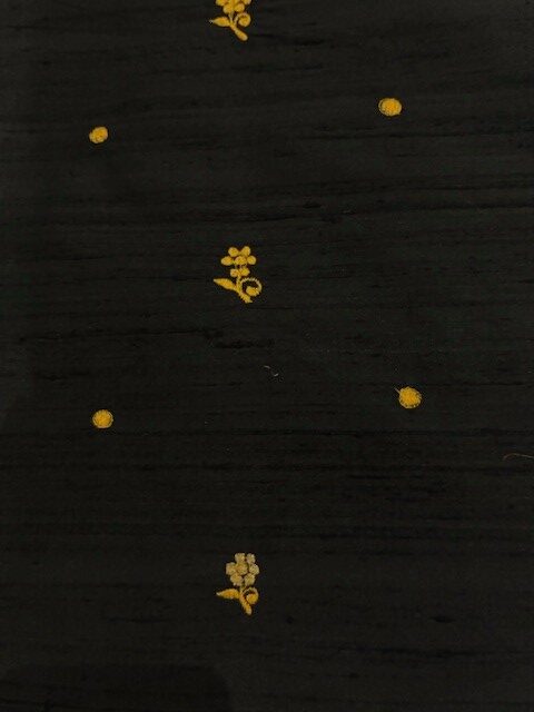 Elegant, zauberhafte Dupionseide, bestickt mit kleinen goldenen Blüten und Punkten. Die Grund-Farbe dieser schönen Seide ist ein tiefes Schwarz.