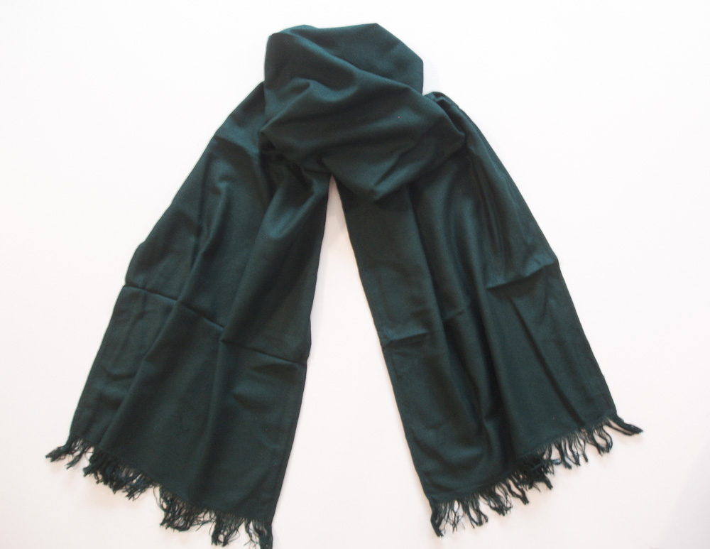 Dunkelgrüner Schal aus feiner Wildseide mit Fransen, gewebt in einer Leinwandbindung. Dies ist der ideale Begleiter in der kühleren Jahreszeit.