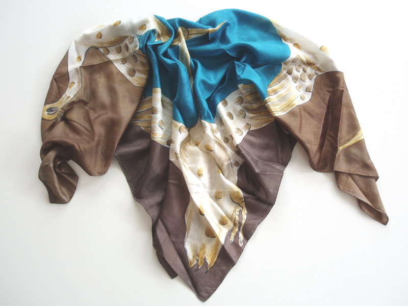 Wunderschönes leichtes Seidentuch, bedruckt mit 4 großen Reihern. Die Grundfarben sind verschiedene warme Brauntöne, Natur und Türkis. Schauen Sie sich bitte auch das andere Bild an, wir haben das Tuch aus ausgebreitet für Sie fotografiert.