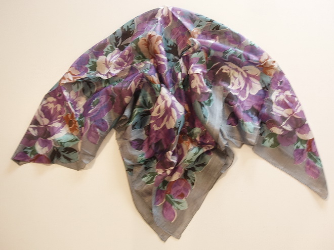 Romatisches Seidentuch mit Rosendruck, die Grundfarbe ist grau.