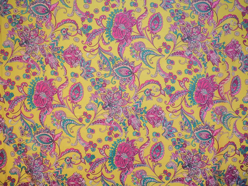 Hier präsentieren wir Ihnen einen Crêpe de Chine aus feinster italienischer Seide mit einem fantasievollen Blumendesign. Diese strahlende Farbkombination aus Gelb, Türkis und Pink versprüht auf den ersten Blick gute Laune!