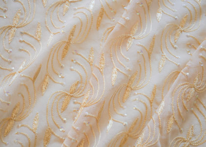 Crêpe Georgette ist ein leichter, fließender Seidenstoff mit einer matten Oberfläche. Unser Sortiment umfaßt viele Farbtöne, sehr beliebt ist die Farbe „ivory“ als Brautstoff oder das leuchtende „royalblau“. Zusätzlich führen wir auch viele bestickte und bedruckte Varianten dieses Seidenstoffs.