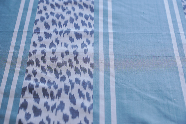 Eine wunderschöne Dupion-Seide in Streifenoptik, wobei sich die blau-türkisen mit den Streifen im Leoparden-Look auf ecru-farbenem Grund abwechseln. Die Streifen haben eine Breite von ca. 12 bzw. 15 cm.