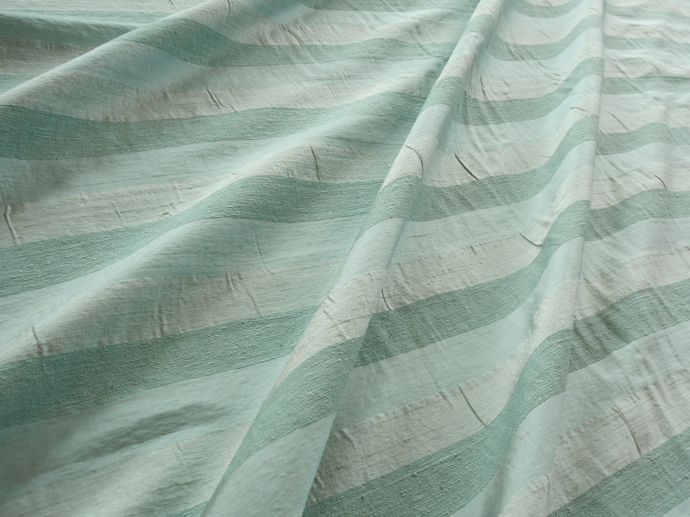 Gestreifte Dupionseide in sanften meeres-grün-türkisen Farben. Die Streifen haben eine Breite von 2,5 cm, sie verlaufen in Querrichtung (Schussrichtung) und haben eine unterschiedliche Struktur. Schauen Sie sich bitte auch die anderen Bilder an, dort sehen Sie den Stoff glatt ausgebreitet und auch in einer Nahaufnahme, sodass Sie die Stoffstruktur gut erkennen können.