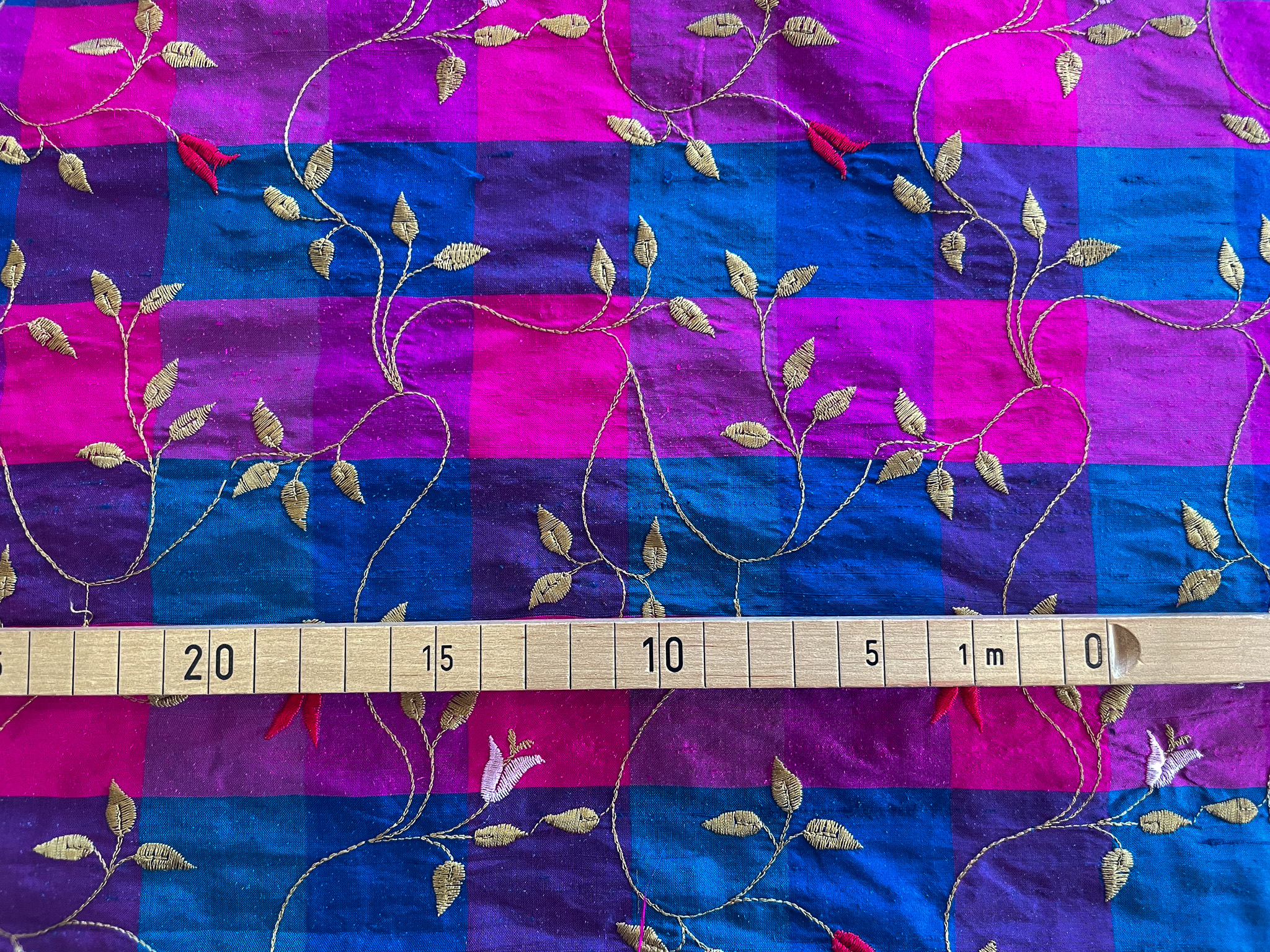 Diese besondere Dupionseide brilliert nicht nur durch das Karo-Muster in den Farben pink, petrol und königsblau, sondern darüber hinaus auch durch das aufgestickte Ranken- und Blüten-Muster.