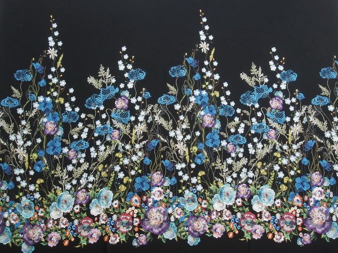 Auf diesem Seidenstoff sehen Sie eine bunte Blumenwiese auf schwarzem Untergrund, wobei die Blüten hier so dargestellt sind als wären sie gestickt. Dieser Seidenstoff ist ein Panneaux (auch Coupon genannt), ein Motivdruck, der über die gesamte Breite des Stoffes reicht und einen sehr großen Rapport hat. Bei dem abgebildeten Crêpe de Chine liegt der Rapport bei 1,15 m.