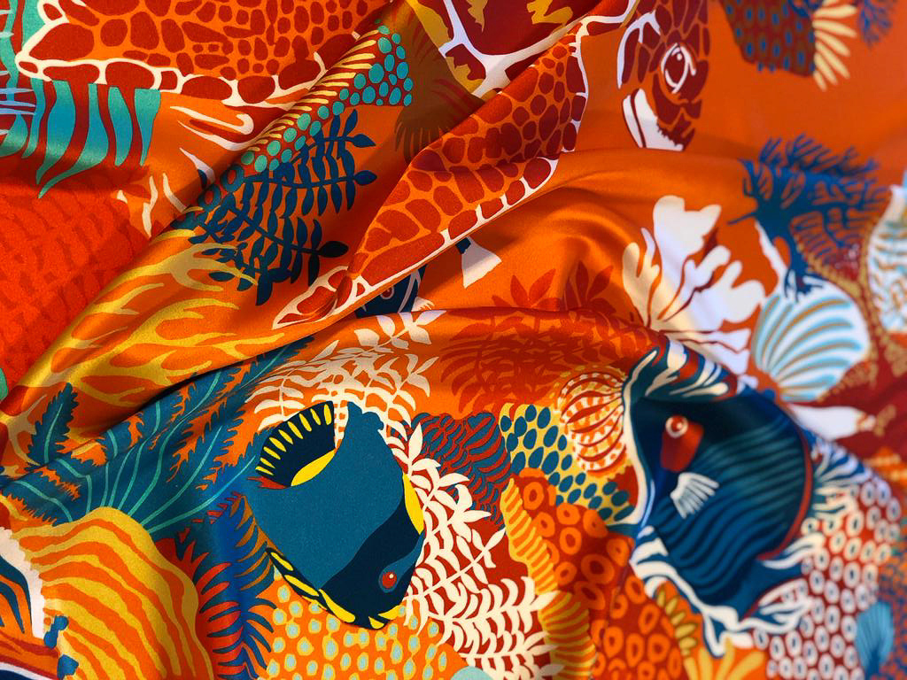 Meeresgetier in kräftig bunten Farben, wie türkis, gelb und blau-rot, tummelt sich auf orangefarbenem Grund dieses fliessenden Stretch Satin.