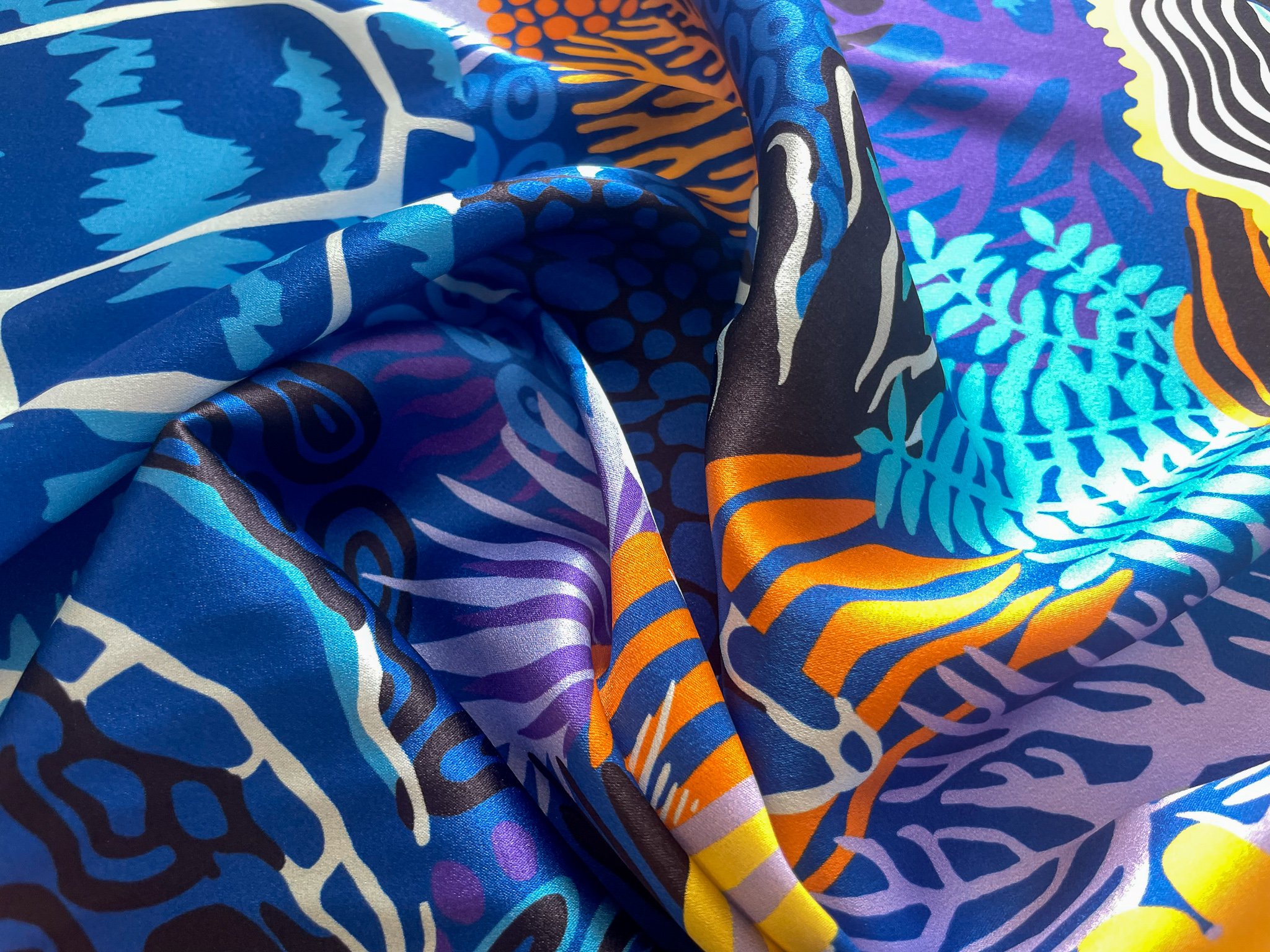 Meeresgetier in kräftig bunten Farben, wie Türkis, Flieder, Orange, Gelb und verschiedenen Blau-Tönen tummelt sich auf dunklem Grund dieses fliessenden Stretch Satin.
