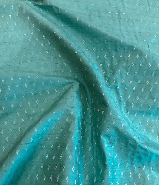 Elegante Dupionseide in einem strahlenden Türkis mit Jacquard-Musterung. Das Muster wirkt durch die nicht ganz gleichmäßige Färbung und Struktur der Seide sehr lebendig.