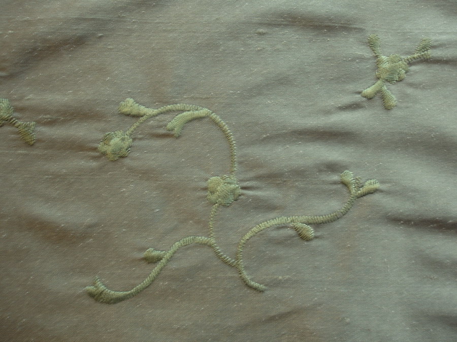 Dunkelgrüne Dupionseide, Ton in Ton dezent bestickt mit kleinen Blütenranken.
