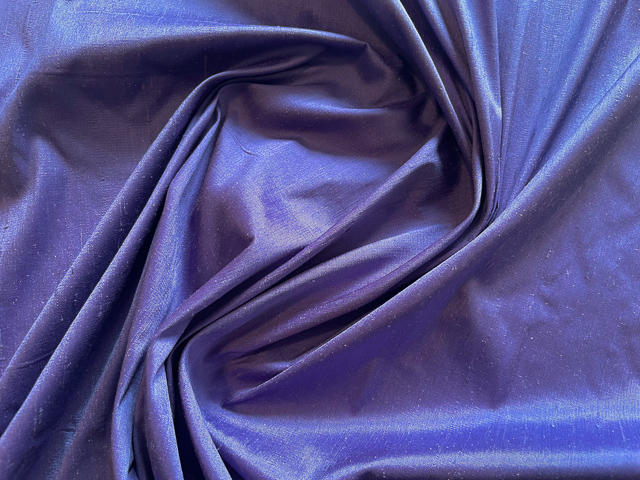 Diese wunderschöne Dupionseide leuchtet in einem Barramundi-Blau mit einem Hauch von Lila.